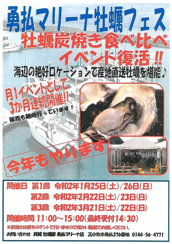 勇払マリーナ駐車場にて、令和2年2月22日(土)・23日(日)、3月21日(土)・22日(日)に「勇払マリーナ牡蠣フェス」が開催されます。牡蠣炭焼きの食べ比べを行うこのイベントでは、海辺の絶好のロケーションも堪能できます。