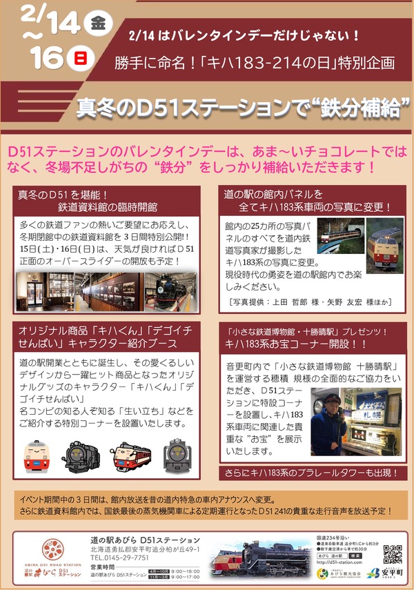 現在ブルーシートの中で冬眠中ですが、その車両番号214にちなみ、2月14からの3日間、あま〜いチョコレートによる“糖質”の補給ではなく、D51ステーションで冬場不足しがちな”鉄分”を補給いただきます!