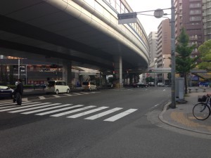 しばらく歩くと信号と大きな交差点に到達します。