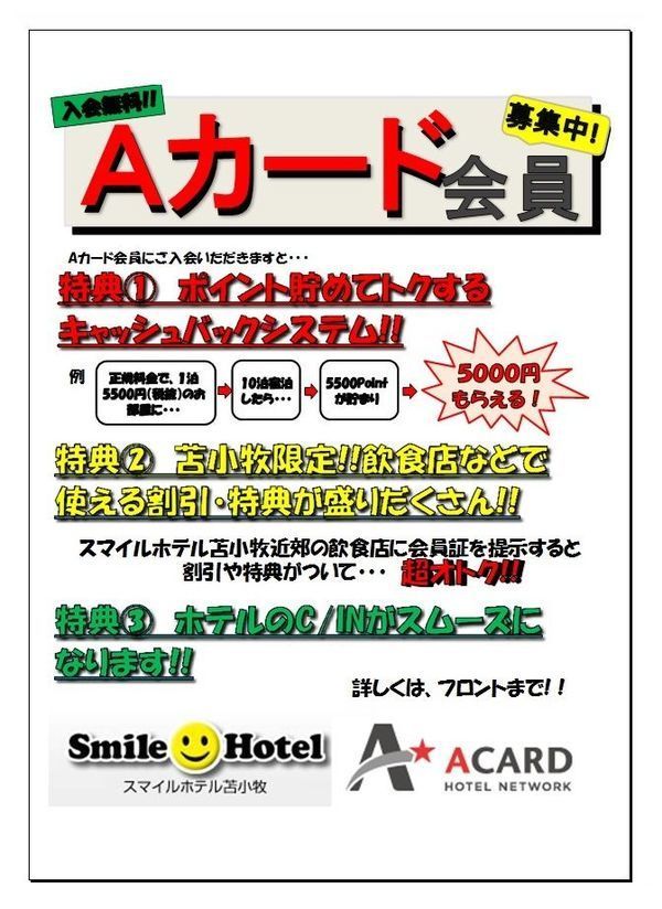 ぜひ、ご出張、ご旅行の際にはAカードをご持参下さい。入会金・年会費は無料となっています。