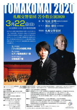 2019年から再開の札幌交響楽団による苫小牧での公演。今回は札響に「黄金時代」を築き上げた尾高忠明(名誉音楽監督)の指揮で、2020年が生誕250年にあたるベートーヴェンの人気曲「交響曲第7番」を演奏します。また、苫小牧出身の注目の若手ピアニスト横山瑠佳が尾高・札響とともにモーツァルト「ピアノ協奏曲第21番」を演奏するのも必聴です。