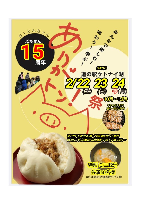 ぶたまん15周年「道の駅ウトナイ湖」にて、ありがトン祭りが開催されます・