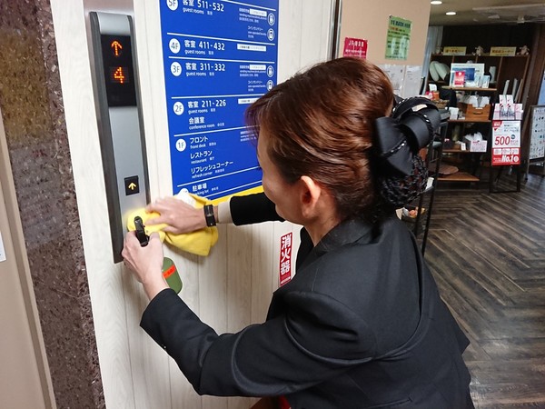 ホテル内各所で、お客様の手指が触れる箇所(カードキー、ドアノブ、ドア、エレベーターのボタン、手すり、お手洗い内など)は、アルコールによる拭き取り消毒を定期的に実施いたしております。