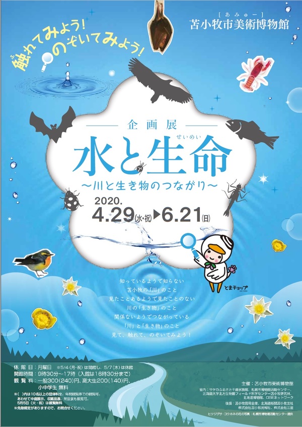 今回は「川と生き物のつながり」をテーマに、苫小牧の川や川にすむ生き物を、標本や模型、写真、絵画などで紹介します。