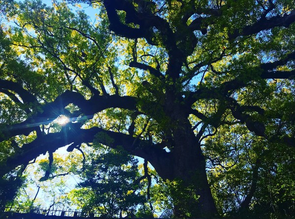右側の緑は、上記の大楠の葉が垂れ下がっているものです。とにかく大きい。