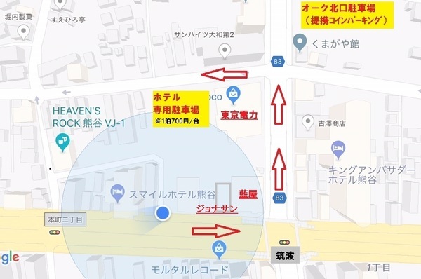 専用駐車場はスマイルホテル熊谷の横にあるジョナサンの裏側にございます。