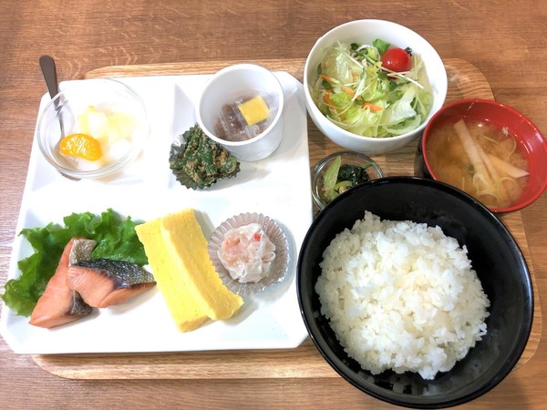 朝食は定食形式、日替わり(丼物や上記のような和定食 または 洋食プレートの選択制)でご用意しております。