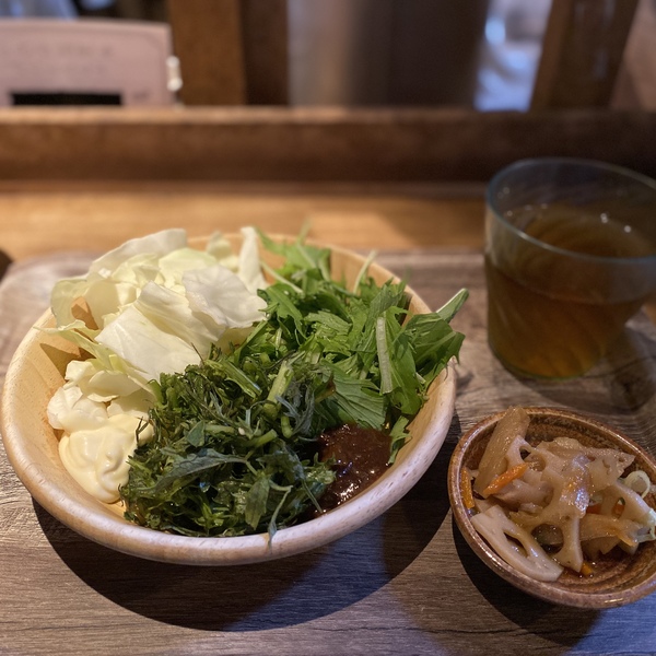 メインの生野菜は4~5種類、おばんざいが2~3種類ほどでメニューは随時入れ替わります。