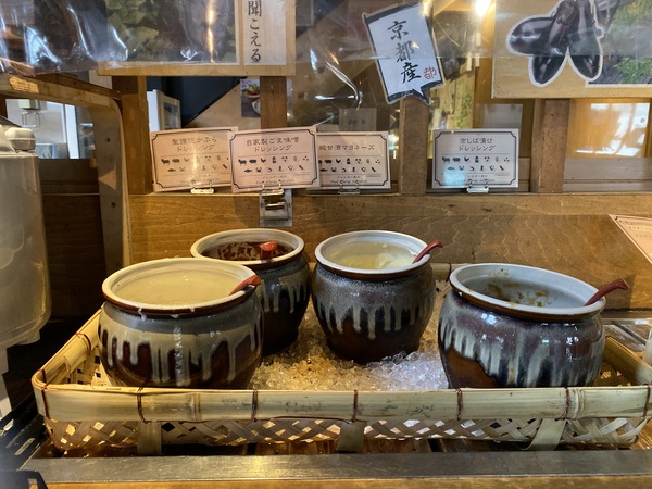聖護院かぶらドレッシング、京しば漬けドレッシング、自家製ごま味噌ドレッシング、糀甘酒マヨネーズと珍しい味ばかりで、どれをかけても野菜がぐっとおいしくなるんです(*^^*)