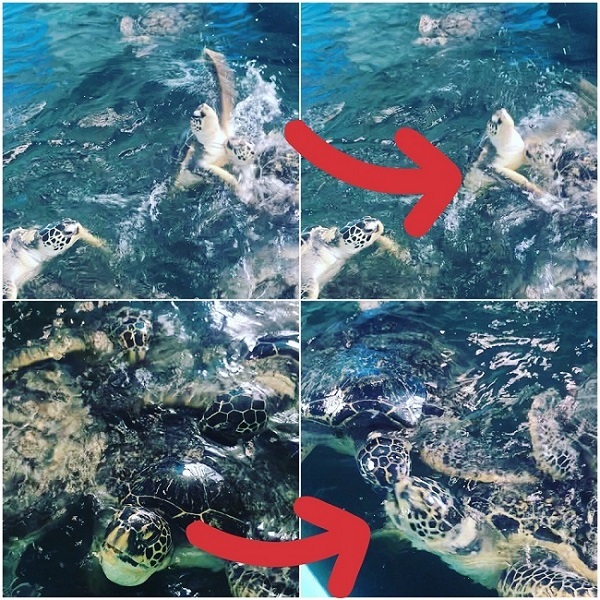 海ガメさんにはエサやり体験ができるので、人を見つけたらすぐ寄ってくるわケンカするわ笑笑