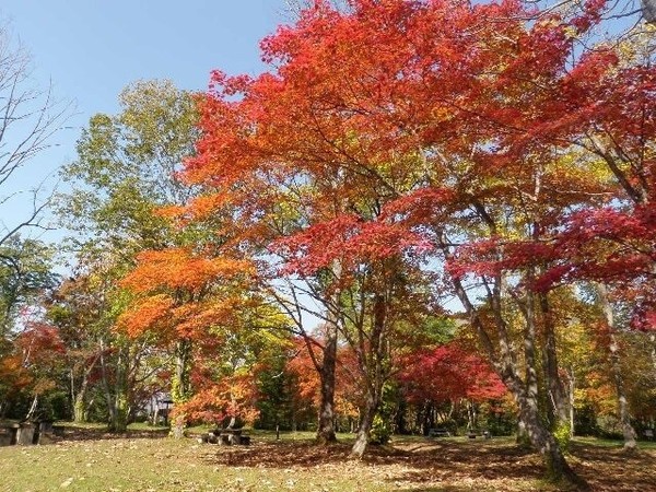 青い空と澄んだ支笏湖ブルー、岸辺の水面に映える紅葉に染まった山々。このコントラストが支笏湖の秋です。遊覧船からの紅葉観賞も好評です。