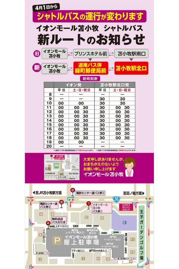 イオンモール苫小牧無料シャトルバスが苫小牧駅北口から出ています。
