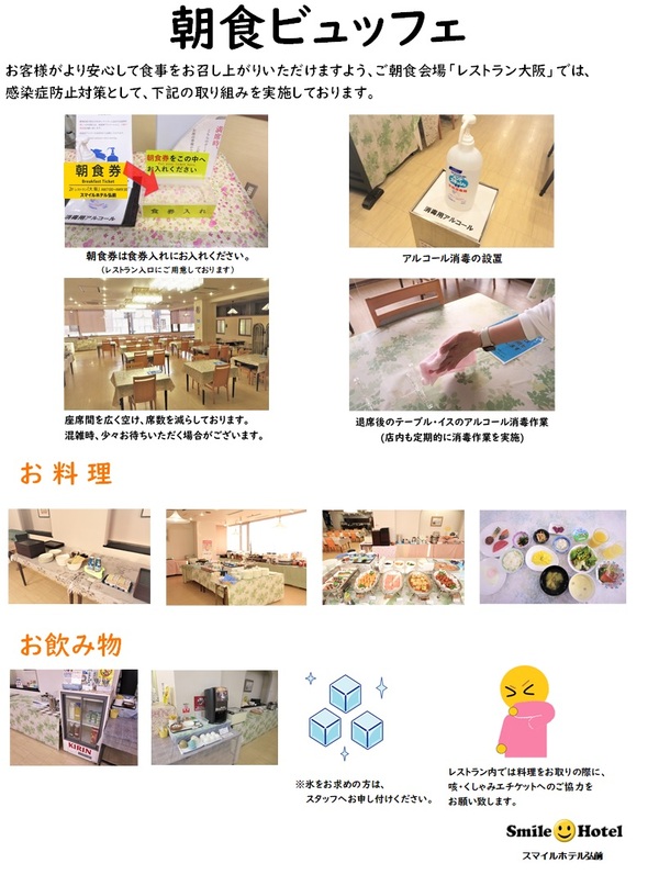 お客様がより安心して食事をお召し上がりいただけますよう、ご朝食会場「レストラン大阪」では下記の感染症対策を実施しております。