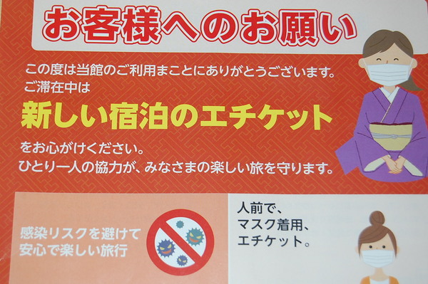 当館では、新型コロナウイルス感染症拡大防止に伴う新しい宿泊のエチケットとして、マスク着用、ソーシャルディスタンスの励行等お願いしております。