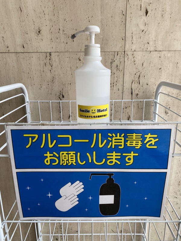 ただいま、スマイルホテル名古屋新幹線口では、玄関にアルコール消毒液を設置させていただいております。ご来館の際は消毒のご協力をお願いします(^^)/