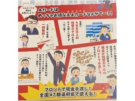 入会費、年会費無料!!加盟ホテルでAカードを提示すれば、名前だけの記入でチェックインが出来て、超便利!!