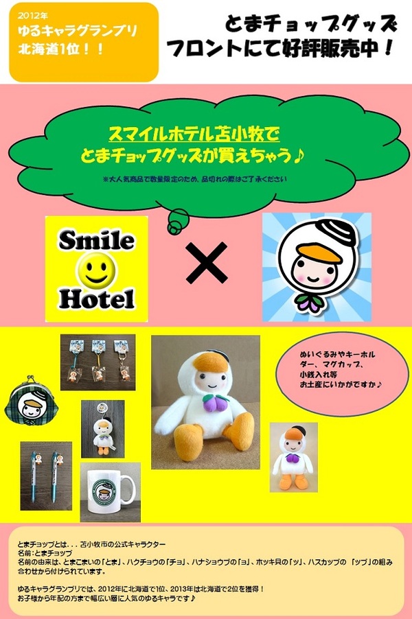 苫小牧市の公式ゆるキャラ「とまチョップ」のグッズをフロントにて販売しております。