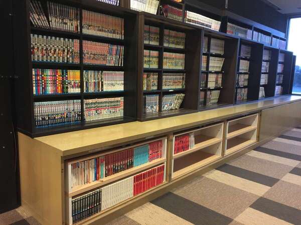 ②2階ロビーにある漫画コーナー2,000冊以上のラインナップ。