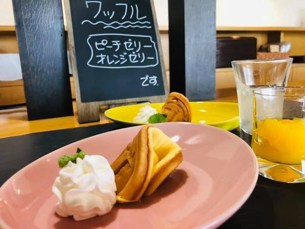 今日は、土曜日ですので、週末限定スイーツはワッフル&ホイップとピーチゼリー・オレンジゼリーでした。