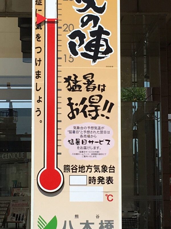 熊谷の夏の風物詩「大温度計」が5月14日、八木橋百貨店の東側入口にお目見えしました。今年で14年目となり、熊谷地方気象台発表のタイミングに合わせて11時と14時に反映する手動の温度計です。