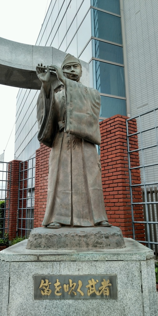 熊谷市のお隣、ネギの街深谷市にある大手口公園には、「笛を吹く武者」の銅像があります。
