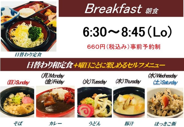 朝食内容:日替わり和定食+曜日毎に楽しめるセルフメニュー