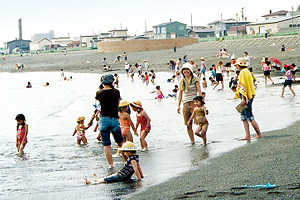 自然海岸や直立護岸を緩傾斜護岸に改良し、高潮などの災害を抑制するとともに、家族連れで楽しめる景観に配慮した海岸と緑地が一体となった憩いの場です。