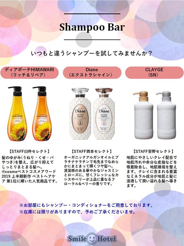 この度スマイルホテル東京西葛西ではシャンプーバーのサービスを開始いたしました。女性に人気のシャンプー&コンディショナーを3種類ご準備しております!