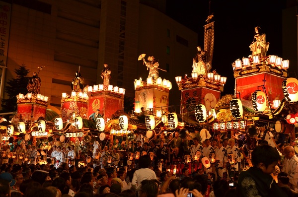 豪華な山車・屋台が市内の地域ごとに分かれ、囃子を奏でながら市内を巡行します。