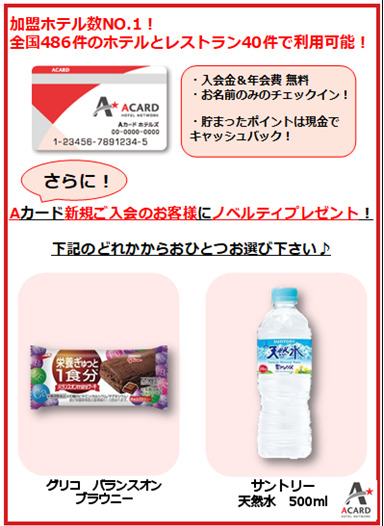 最近では『Aカード』というホテルカードを新規ご入会して頂きますと500㎖ペットボトルのお水またはお菓子をプレゼントさせて頂いておりますので、気になった方は是非フロントまでお申し付けください。