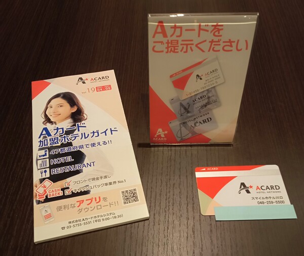 Aカードは全国の加盟ホテルでご利用頂けるポイントカードでございます。ポイントを貯めるとフロントにて現金でのキャッシュバックが可能で、キャッシュバック率業界No.1の非常にお得なポイントカードとなっております。また、全国の加盟ホテルで記名のみでチェックインが可能になります。
