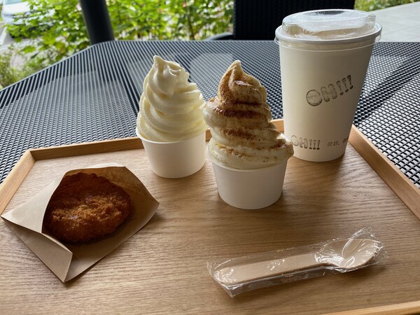 こちらの写真は[糀ソフトクリーム]です。左がプレーン、右が醤油味です。目珍しいと感じましたので、プレーンを購入。思った以上に酒粕の味は控えめでした。しかし、通常のソフトクリームよりも、さっぱりした甘さで、大変おいしかったです!!!