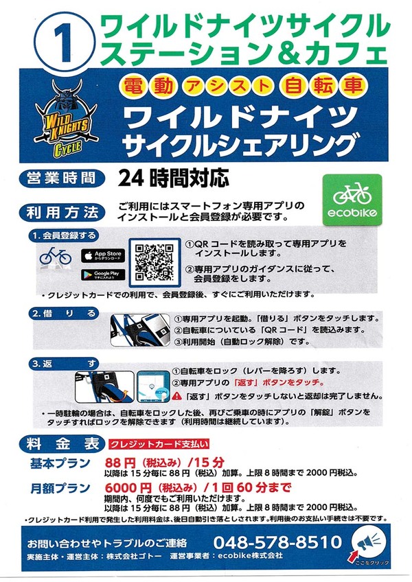 利用料金は15分88円。スマートフォンの専用アプリを使い、1アカウントにつき自転車1台の利用が可能。アプリ上でサイクルポートの場所や現在ある自転車台数を確認でき、その場で自転車に設置されているQRコードを読み取ることで解錠、利用できる。利用中駐車する場合は手動で鍵をかけ、アプリで解錠する仕組み。乗り終わったらサイクルポートに駐輪して鍵をかけることで利用終了となる。アプリで事前にクレジットカード決済の登録が必要。    自転車はパナソニック社製の電動アシスト自転車「グリッター」をワイルドナイツブルーの限定色で100台。20インチ・3段変速付・フル充電で最大約75㎞まで走行できます。