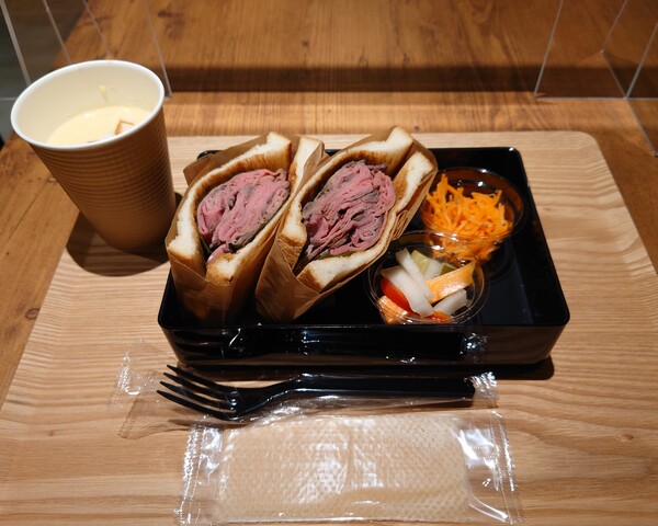 「出来たて極ローストビーフサンド(80g)」と「特製スープ」。