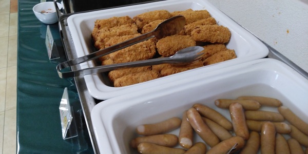 本日の朝食メニューは、チキンチーズ大葉巻、麻婆茄子、ベーコン、もつ煮、ウインナーとなっております。