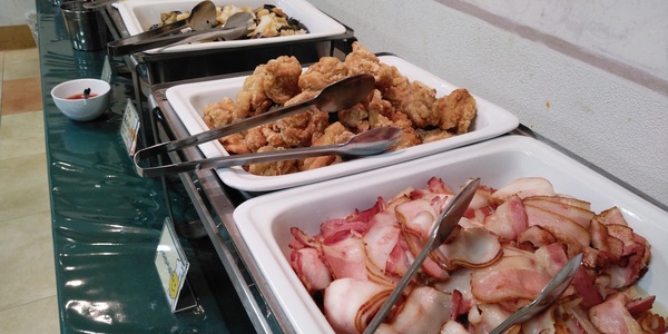 ベーコン、唐揚げ、なすの揚げびたし、スクランブルエッグなどとなっております。