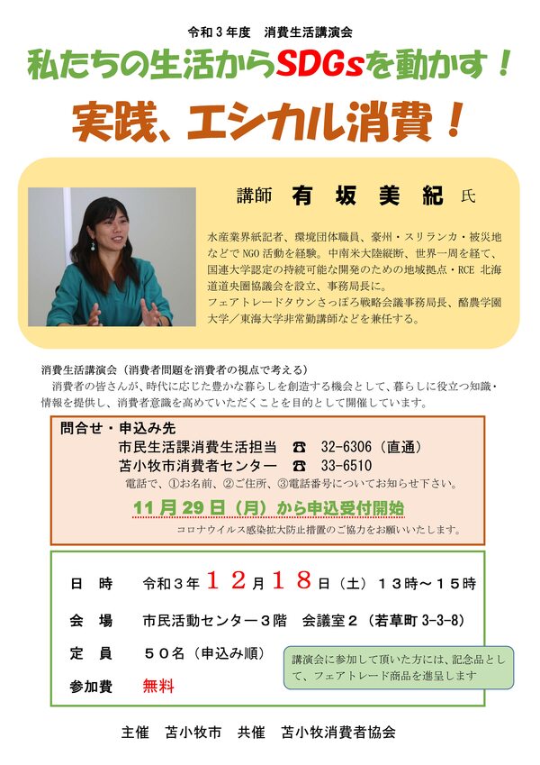 「持続可能な開発目標(SDGs)」や、環境や人権に配慮した消費行動「エシカル消費」の実践を学ぶ消費生活講演会。