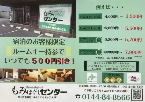 スマイルホテル苫小牧の1階にある、もみほぐしセンターさん、