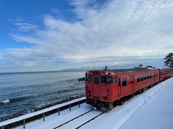 この赤色の電車は、高岡駅発なのでこの電車に乗車し景色をみるのも良し、
