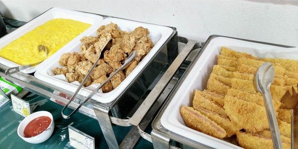 本日のご朝食のメインメニューは、鶏の唐揚げ、ハムカツ、スクランブルエッグなどとなっております。