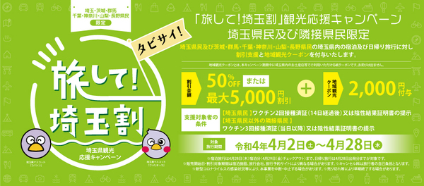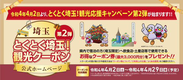 4/2より始まりました埼玉県内の対象宿泊施設に宿泊した際に、1人1泊あたり最大3,000円分の「とくとく埼玉!観光クーポン券」を配布するキャンペーン事業です。注意事項として次の2点を満たす必要があります。