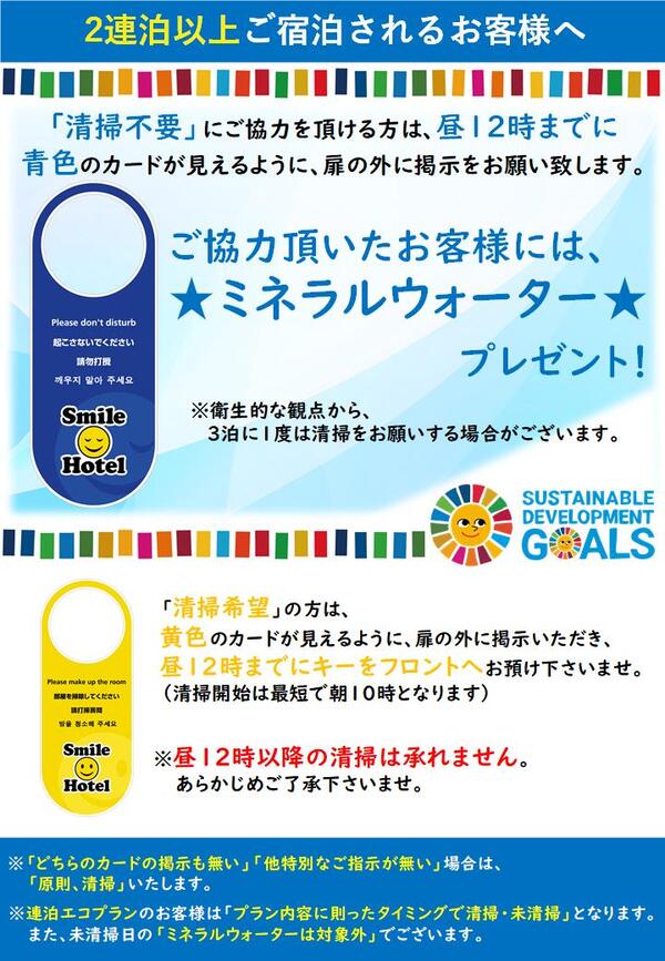現在スマイルホテル熊谷では、連泊をされるお客様がご滞在時の清掃をご不要と申告していただいきますとミネラルウォーターをプレゼントいたしております。この取り組みは、SDGs(サスティナブル・ディベロップメント・ゴールズ)の目的の一つとして清掃時に使用する水光熱エネルギーやリネン削減を推進するために行っております。