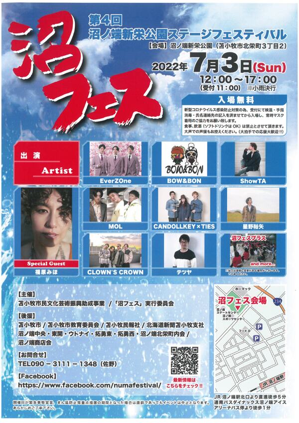 沼ノ端新栄公園野外ステージで、市民の皆さんにクオリティの高い音楽を「体験・体感」してもらい、苫小牧市の文化レベルの底上げをしたいという思いで平成29年度から開催している「沼フェス」が、3年ぶりに開催されることになりました。