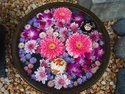 【花手水】はなちょうずとは…神社やお寺で参拝をするとき、柄杓(ひしゃく)で水をすくって身と心を清める場所を手水舎(ちょうずしゃ)というのですが、手水舎の手水鉢(ちょうずばち)に花を浮かべたものが花手水(はなちょうず)と呼ばれています。 花手水には季節の旬な花々を浮かべるのが定番となっており、彩り豊かなのも特徴です。