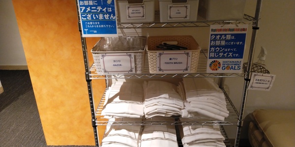 お部屋にはタオル類以外のアメニティはご用意しておりませんので、チェックインをお済になられましたら、こちらのラックからアメニティをお取り下さいませ。
