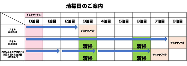 また、全日程清掃不要や清掃日の調整はチェックイン日以降にフロントにてお伺いいたします。
