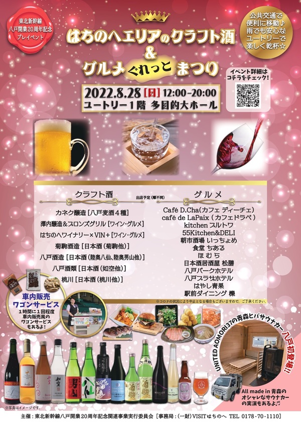 8月28日(日)に、東北新幹線 八戸開業20周年 プレイベント 「はちのへエリアのクラフト酒 & グルメぐれっとまつり」が、JR八戸駅前にある、「ユートリー 1階多目的大ホール」で開催されます。