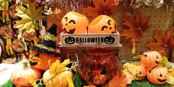 某100円均一ショップさんの商品力と当館スタッフ(私)の類まれなる美的センスにより、今年も当館ロビーは賑やかなハロウィーンパーティーになりました!