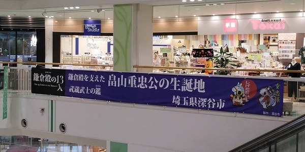 深谷市のランドマークである「アリオ深谷」では、郷土の偉人は渋澤栄一だけじゃあないんだぞ!といわんばかりに、大々的に畠山重忠公の横断幕が飾られています。抜かりないですねぇ~