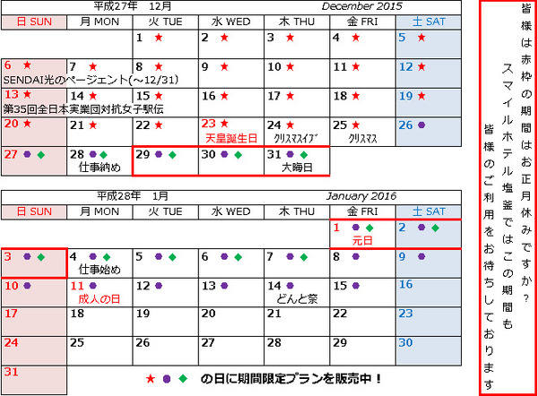 スマイルホテル塩釜では好評頂いております【 12月~1月の期間限定プラン 】を今年も設定。